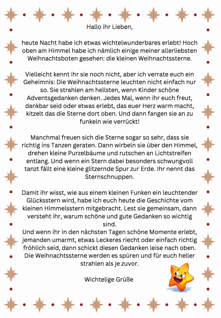 Skala! Heute bin ich noch einmal zurück gekehrt um meine Sachen abzuholen. Die meisten von euch haben sich hoffentlich das Buch vom kleinen Weihnachtsstern abgeholt. Für alle hier noch mal die schönen Worte dazu. Ich hoffe, ihr hattet alle schon viele fröhliche Gedanken, die die Weihnachtssterne spüren konnten. Ich hatte zumindest den Eindruck, dass die Sterne in den letzten Tagen wirklich sehr kräftig gestrahlt haben!
