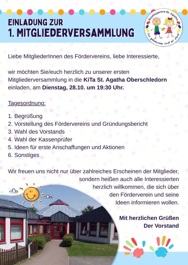Nun möchten wir Sie/euch herzlich zu unserer ersten Mitgliederversammlung in die KiTa St. Agatha Oberschledorn einladen, am 28.10. um 19:30 Uhr.